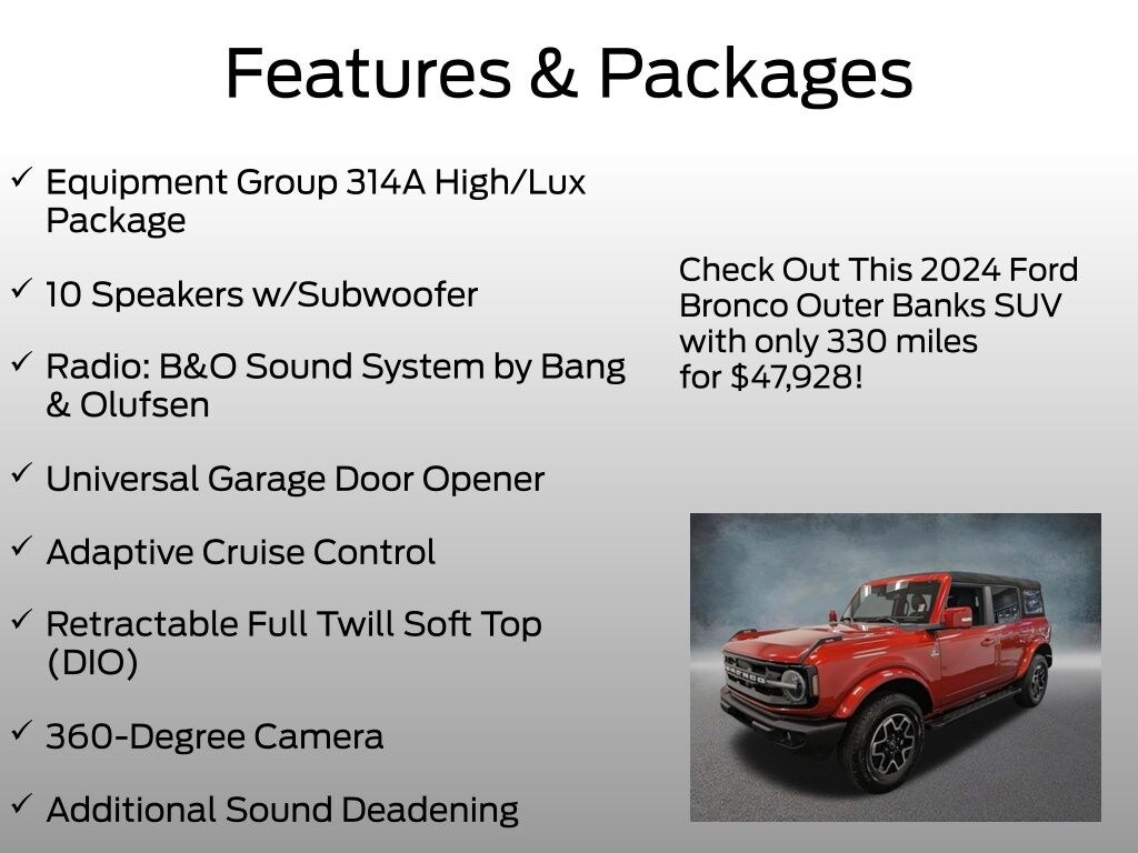Whether you're tackling the great outdoors or navigating the urban jungle, the 2024 Ford Bronco Outer Banks is the ultimate expression of rugged capability and refined sophistication. Experience the thrill of the open road and the freedom of the wild with this exceptional SUV.