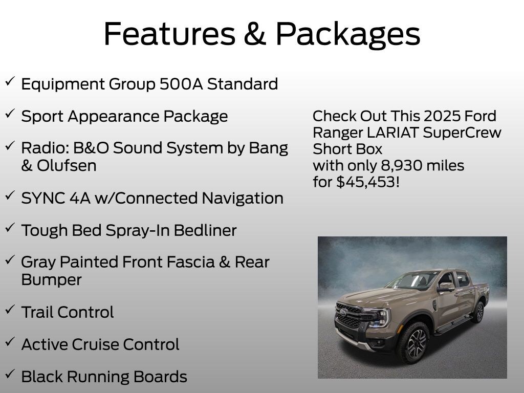 Meticulously crafted with your needs in mind, the 2025 Ranger Lariat comes equipped with a host of premium features, including: