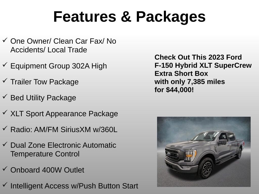 Introducing the exceptional 2023 Ford F-150 XLT, a true workhorse that blends power, capability, and modern sophistication. This one-owner, accident-free truck is the perfect companion for your adventures, whether you're tackling tough jobs or exploring the great outdoors.