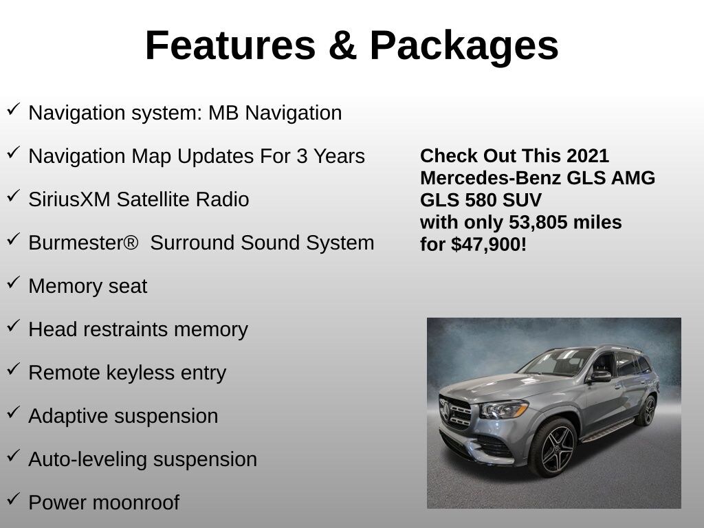 Meticulously crafted with your comfort and convenience in mind, this GLS 580 4MATIC® offers an unparalleled driving experience. Standout features include the - Burmester® Surround Sound System, Navigation Map Updates For 3 Years, SiriusXM Satellite Radio, Head restraints memory, Memory seat, Remote keyless entry, Power Liftgate, Adaptive suspension, Auto-leveling suspension, Apple CarPlay®/Android Auto®, and Navigation system: MB Navigation.